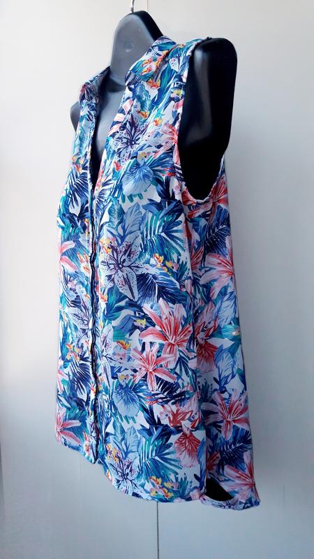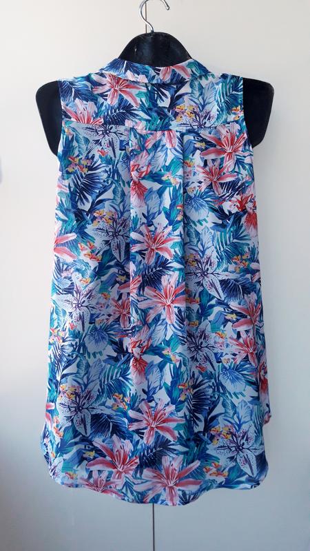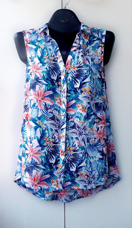 Яркая Блузка без рукавов из шифона с набивным рисунком. Треугольный вырез горловины с отложным воротничком ,застежка на пуговицы . Скругленный нижний край ,спинка длиннее полочки .Сзади встречная складка. Пройма очень удачная,бельё не видно.