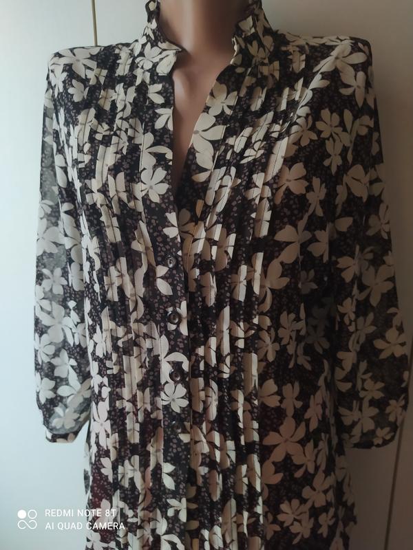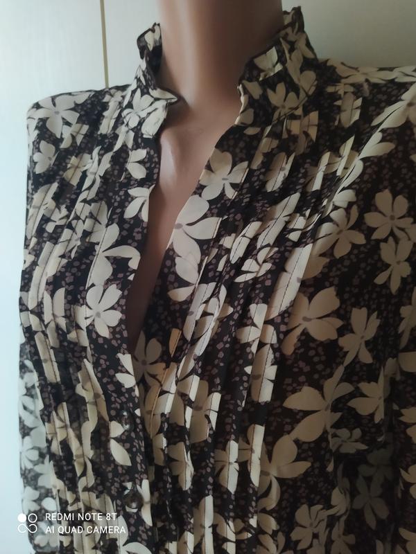 Шикарная и очень интеллигентная блузочка . Отлично сидит на фигуре Ткань типа ,,шифон,,Рукав 3/4 ,воротник стоечка вместе с рюшами. 4см / по затылку/ Последние пуговички заканчиваются на груди.Выточки втачные, классические. .Защипы мелкие по 0.5 см.От подмышки до подмышки- 55 см.П ОТ- 52 см.Длина рукавчика с маленьким манжетиком- 46 см .Длина блузы без воротничка стоечки-64 см.Все меряла спереди.Цвета: белый, серый, коричневый, черный.