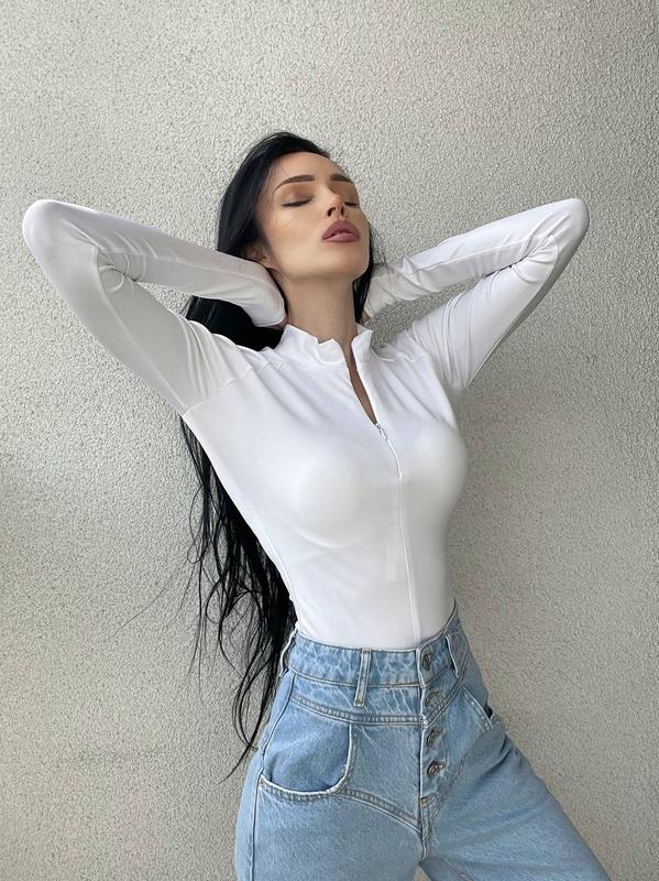 Женский боди под горло на молнии «Sweet» #272 Ткань - микродайвинг Цвет - белый серый Размер - 42 44 46 48 Женский боди под горло имеет приталенный крой и длинные рукава. Спереди изделие застегивается на молнию. Изделие выполнено из микродайвинга, не образуют катышек, не «пускают» стрелки, отлично держат форму, моментально высыхают. В процессе носки замечено несколько полезных особенностей материала: он способен отводить влагу с поверхности кожи, не линять и противостоять нагрузкам.