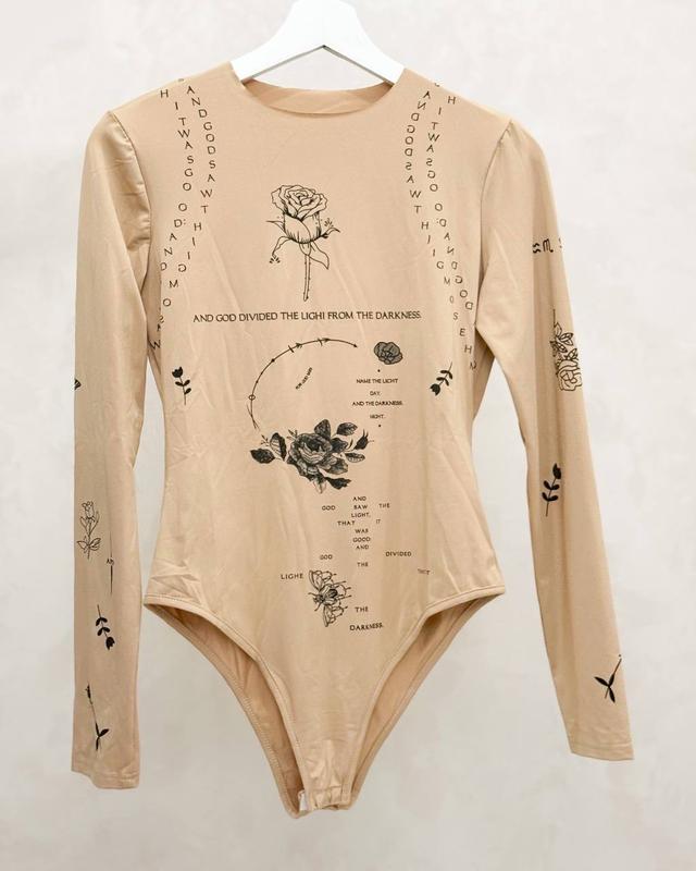 8069-1553Боди с принтом, с длинными рукавами и кнопками внизу Ткань: микродайвинг Размер: универсальный 42-46 (длина - 70 см, тянется; тянется на ОГ до 100 см; рукав - 61 см. Цвет: черный, серый, бежРаботаем по предоплате 200 грн.