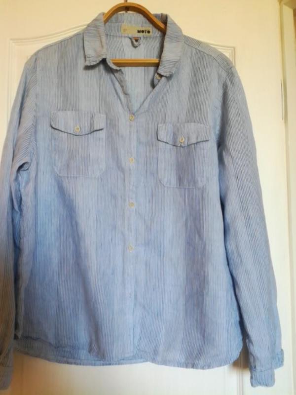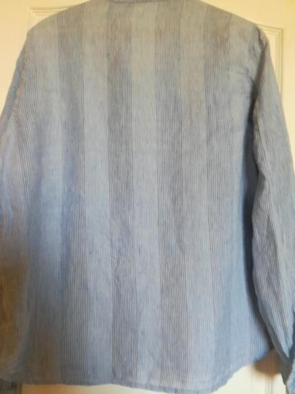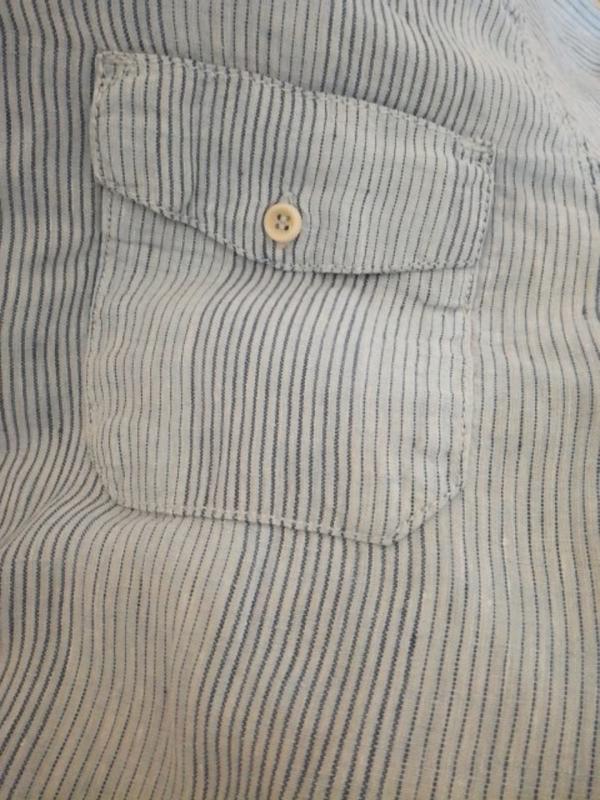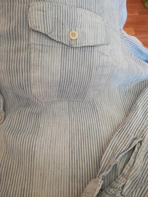 Цвет «хмурого неба» голубо -серый.Принт вертикальная синяя полоска.Состав 100% лен.Качество льна и пошива отличное.Лен мягкий легкий и дышащий.Два накладных кармана с клапанами на пуговицы.Размер 16Замеры ПОГ 59 см.Длина 68 см .Длина рукава 64см.Ширина плеч 44см.Сделана в Турции.Зорошо дополнит Ваш Denim Look.