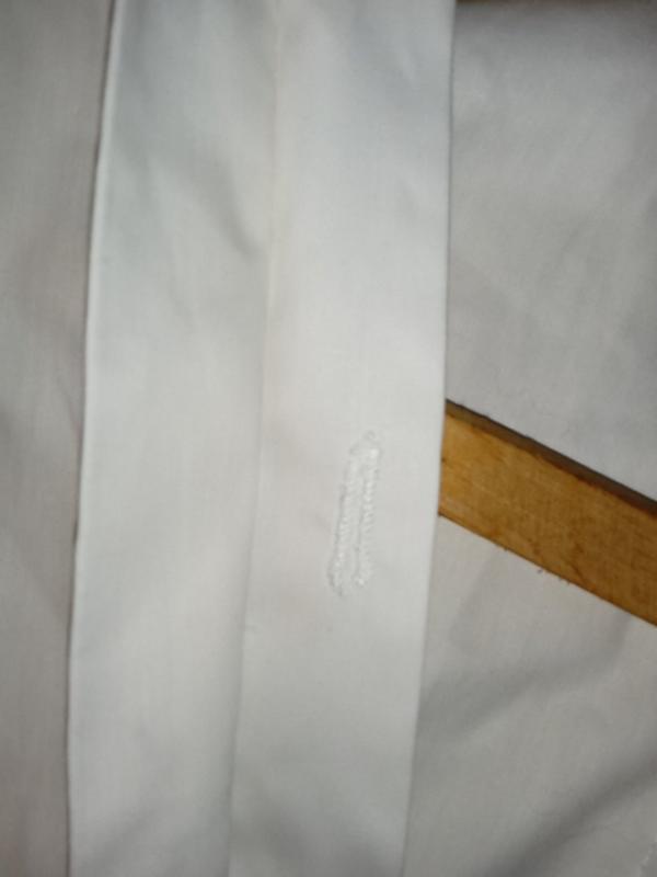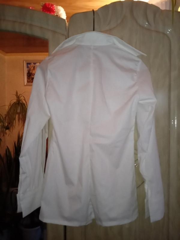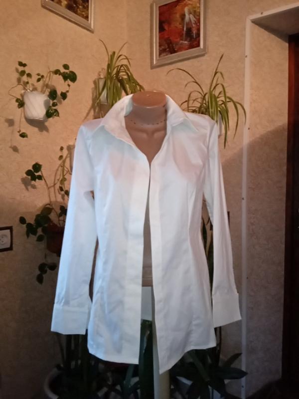 Нова . Белоснежная, пошитая по фигуре,гудников нет, на рукавах широкий манжет на две пуговицы. Для точности размера смотрите Мои замеры - д.67, плечи 37,. п о г 46,. п т 42,