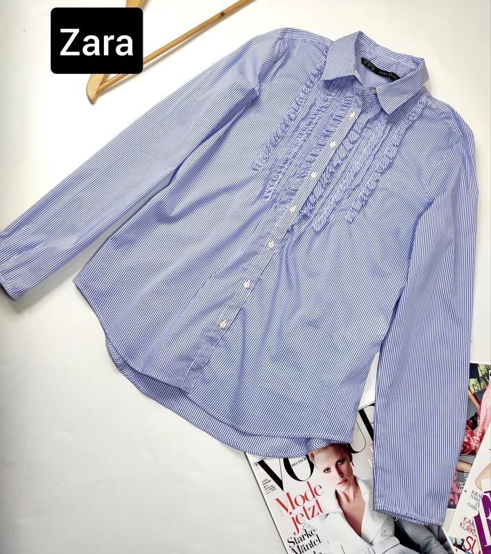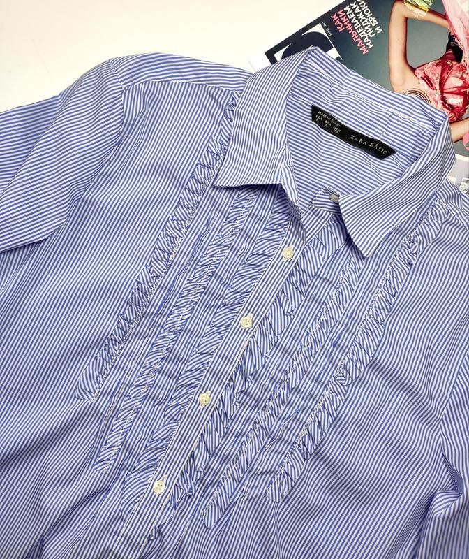 рубашка женская в полоску, голубого синего цвета, с жабо рюшами, в идеальном состоянии, указан размер л, по факту м )