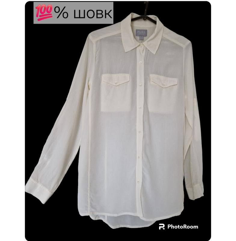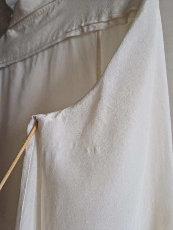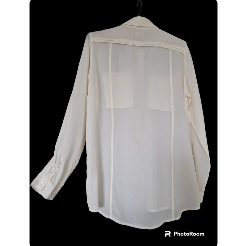 Шелковая рубашка в молочном цвете, размер М-L. Есть небольшой нюанс: на одном из рукавов сзади слегка эффект растянутой ткани (фото 3), не совсем заметен, в цене учтена. Больше никаких следов износа нет.