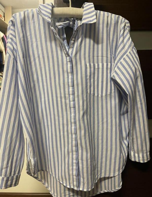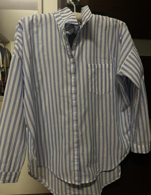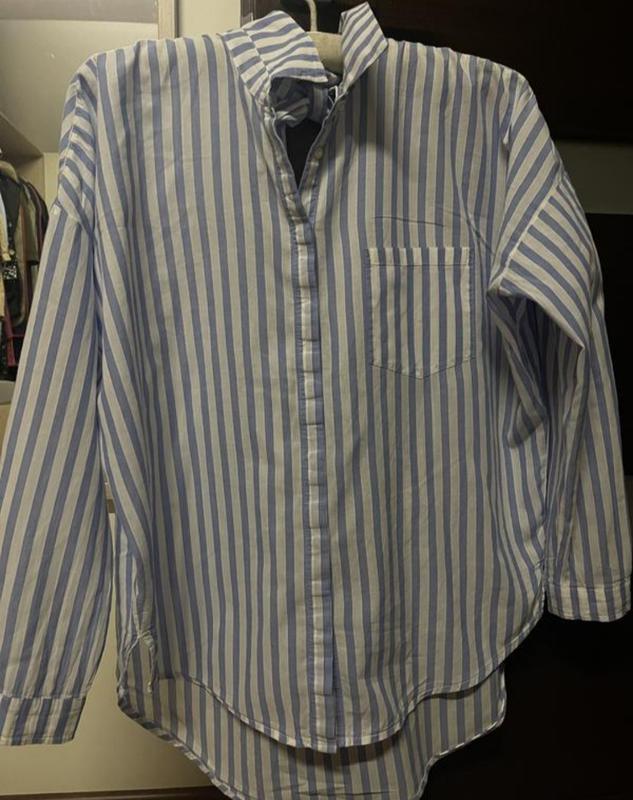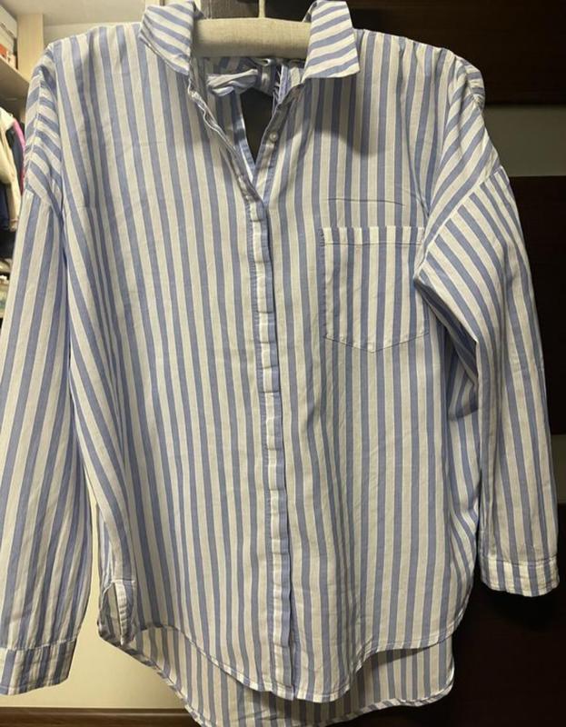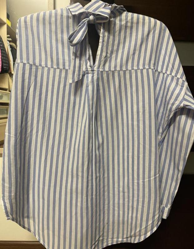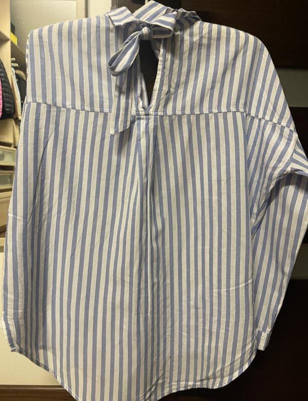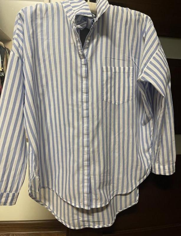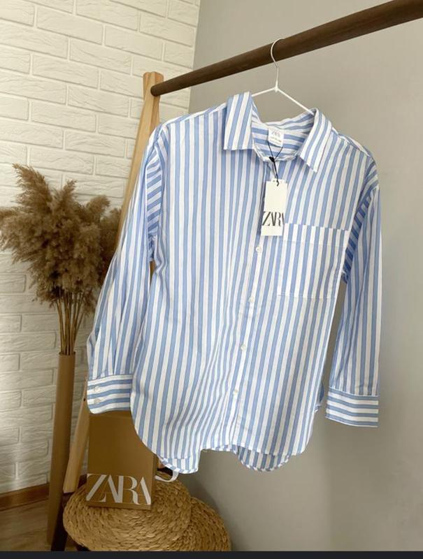 рубашка Zara белая в голубую полоску на бирке M со спущенным рукавом лёгкая невесомая зад на завязке на бирке от производителя XS свободного кроя смотрите замеры ( рубашка которая создаст супер образ) состав 100%котон лёгкий
