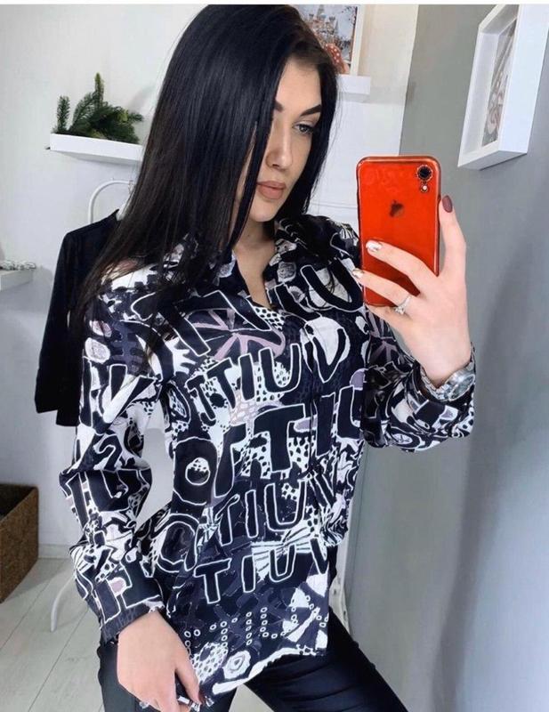Модная женская рубашка с надписями, красивая модель красивого кроя, с длинным рукавом и застегивается на пуговицы. Модель придает своей обладательнице модный образ.Изделие хорошо сочетается с юбками, брюками, джинсами или леггинсами.
