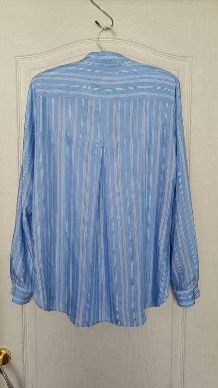 Легкая нежная шелковистая рубашка в продольную полоску от H&M. Цвет нежный голубой. Отложной воротничок. Закругленный нижний край, немного удлиненный сзади. Защипы на манжете, застегивающиеся на пуговицы. Приспущена линия плеча. Состав: 100% вискоза. Ткань легкая, мягкая, шелковистая. Состояние идеальное, новой вещи.