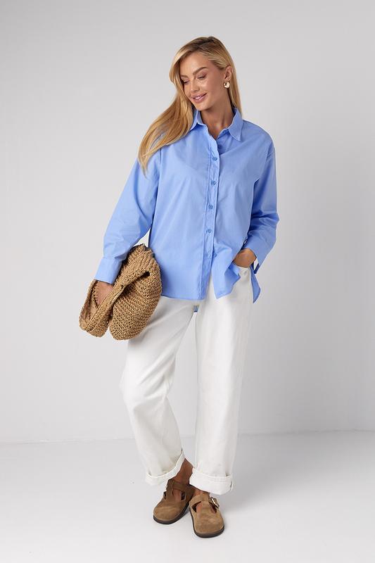 Рубашка спереди застегивается на пуговицы, плечи в изделии удлиненные, полукруглый низ, а боковые швы заканчиваются высокими разрезами.