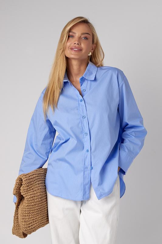 Стильная полосатая рубашка оверсайз полностью украшена тонкой вертикальной полоской.