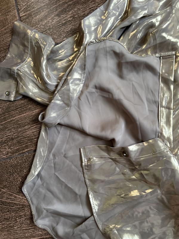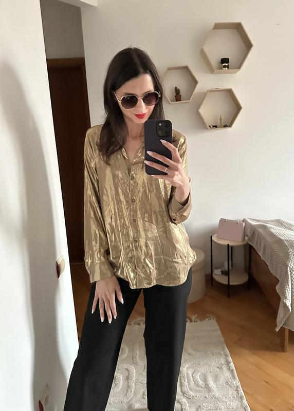 Красивая рубашка от ра. Какой же невообразимый цвет. Золотистый. Можно подобрать очень разные образы. На новогодние праздники также подойдет. Размер S. Замеры : длина 64см, ПОг 51см..