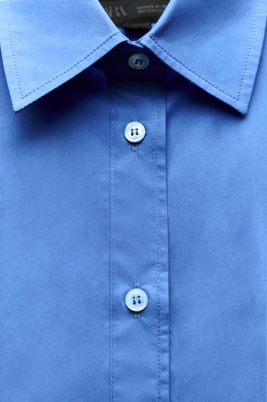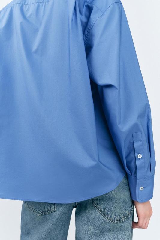 Рубашка свободного кроя из штапельного хлопка с классическим воротником. Длинные рукава с манжетами, накладные карманы на груди, асимметричный закругленный низ и застегивается на пуговицы спереди.