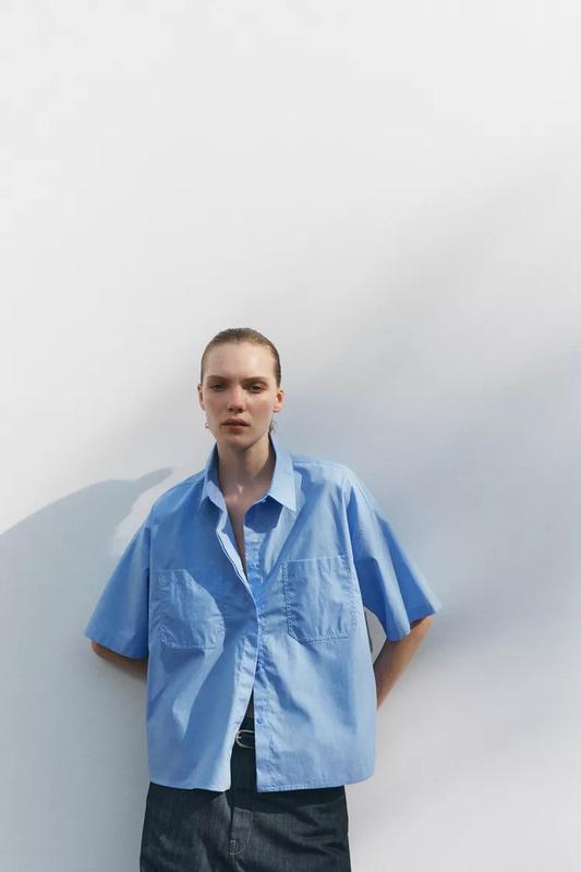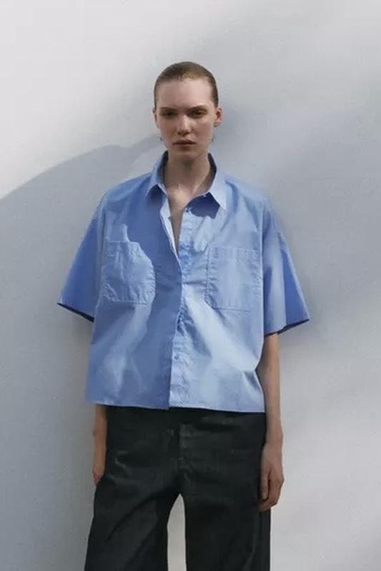 Рубашка с классическим воротником, выполненная из штапельного хлопка. Короткие рукава, накладные карманы спереди. Застегивается на скрытые пуговицы спереди.