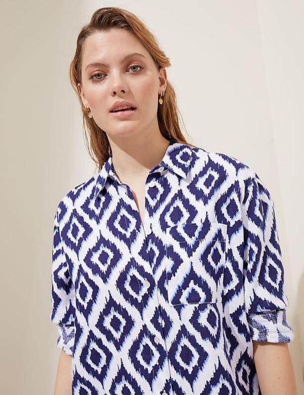 Рубашка оверсайз в принт из 100% льна от Marks & Spencer. Прямой свободный крой, воротник, длинные рукава и застежка на пуговицы. Нагрудна кишеня. Скругленный подол.