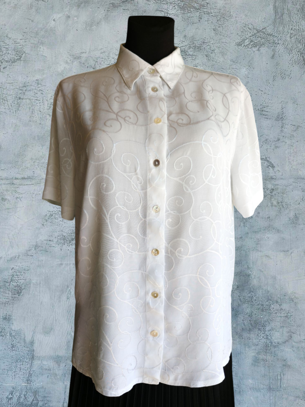 ❗100% вискоза Невероятный жаккардовый узор с блеском🪡 Пуговицы из перламутровой ракушки. Состояние хорошее, одна пуговица со чербинкой - есть дополнительный. Классика элегантности, немецкого качества и натуральных материалов. Размер указанный 40 Подойдет на M–XL Замеры: НОГ — 56 см Воротник - 40 см Плечи - 46 см Пройма - 27 см Длина рукава - 23 см Длина по спинке – 69 см Полуобхват по низу - 54 см