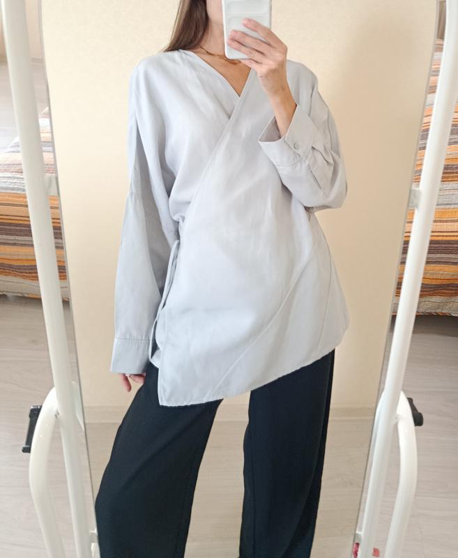 Рубашка на запах с льном COS. Состояние отлично. Плотная, не тянется. Оверсайзна. Цвет светлый серый. Размер 38-40. 78% лиосел, 22% лён Длина 72см Рукав от горловины 73см Пог 54см Оплата на карту!!