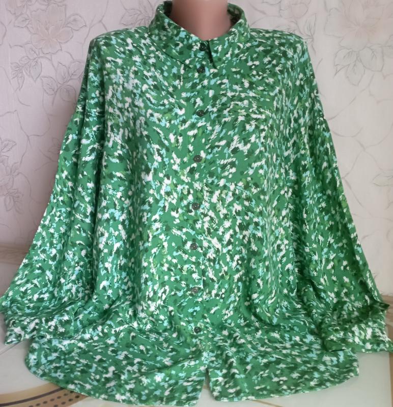 Рубашка женская, яркая, оверсайз, удлиненная, зеленого цвета с анималистическим принтом, плечи спущенные -свободно, ПІГ 65, ПИТ 64-65, рукав от горловины 72, длина изделия спереди 71 сзади 76. Бирка со составом срезанная, ткань узора.