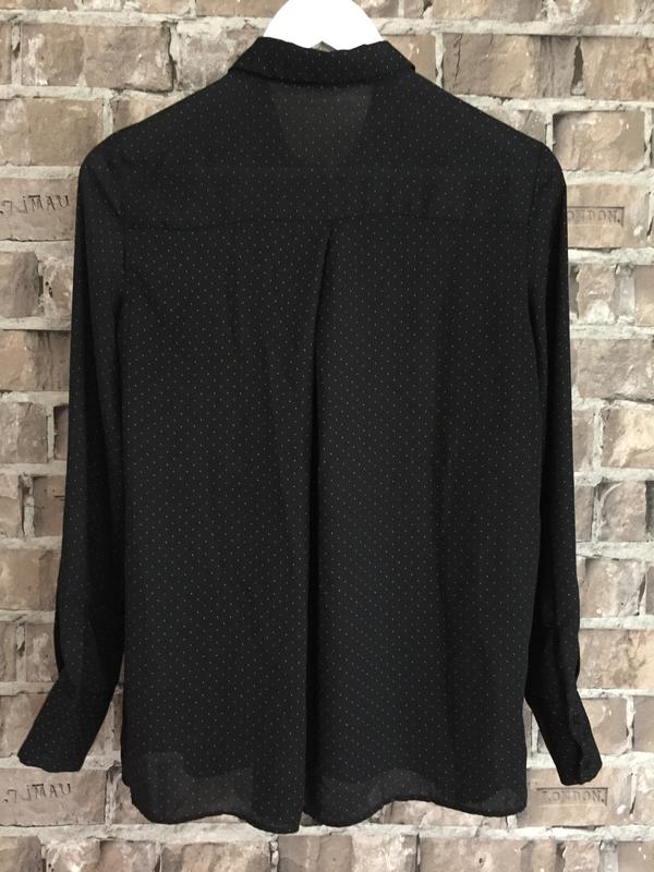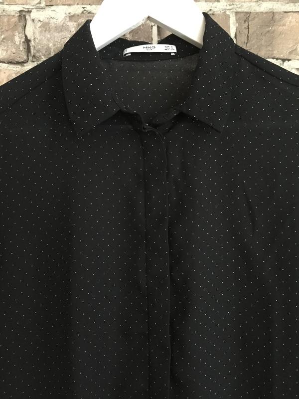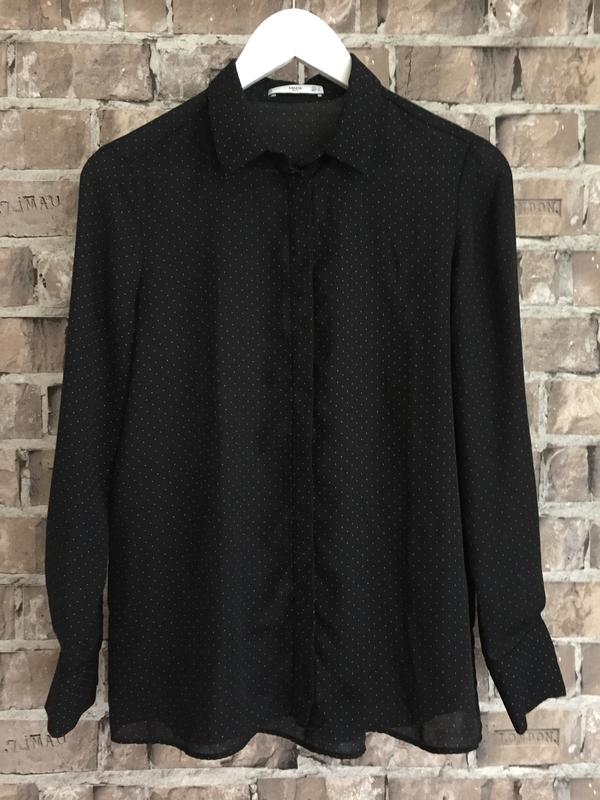 Класна рубашонка mango, чорна в горошок, розмір с вказано, думаю буде на м-ку невелику. Має стан нової речі. Бокова бірка зрізана. Дуже тендітна рубашечка.