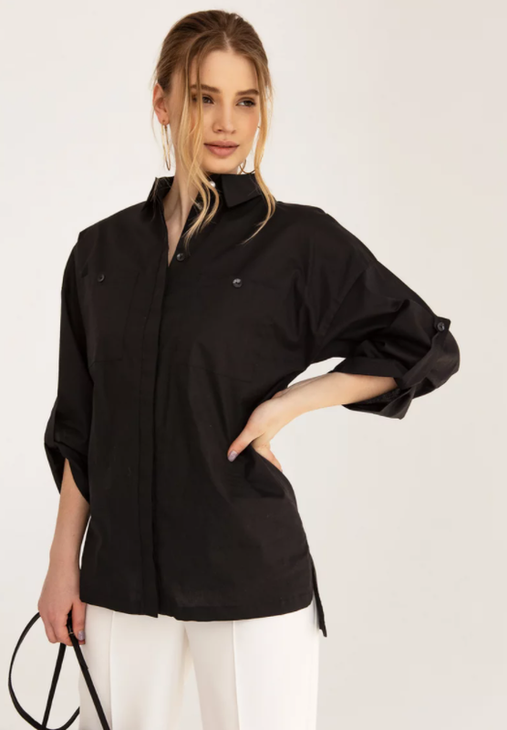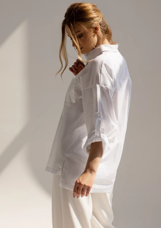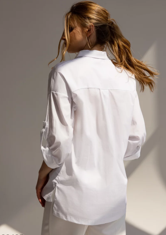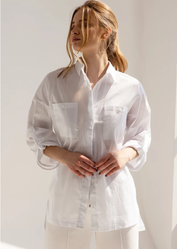Рубашка белого цвета – обязательный must-have в любом гардеробе. Она легко адаптируется под образ в самых разных стилях и гамме. Модель выполнена из смесового хлопка. Свободный крой со спущенной линией плеча дополнен рукавами с застежками-патами, накладными карманами на груди и асимметричной нижней кромкой с разрезами.