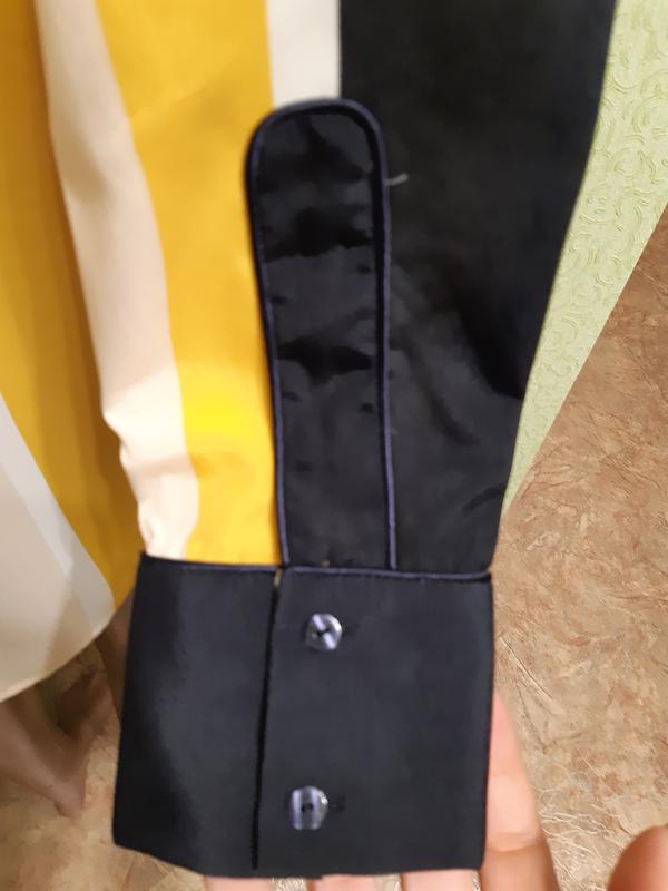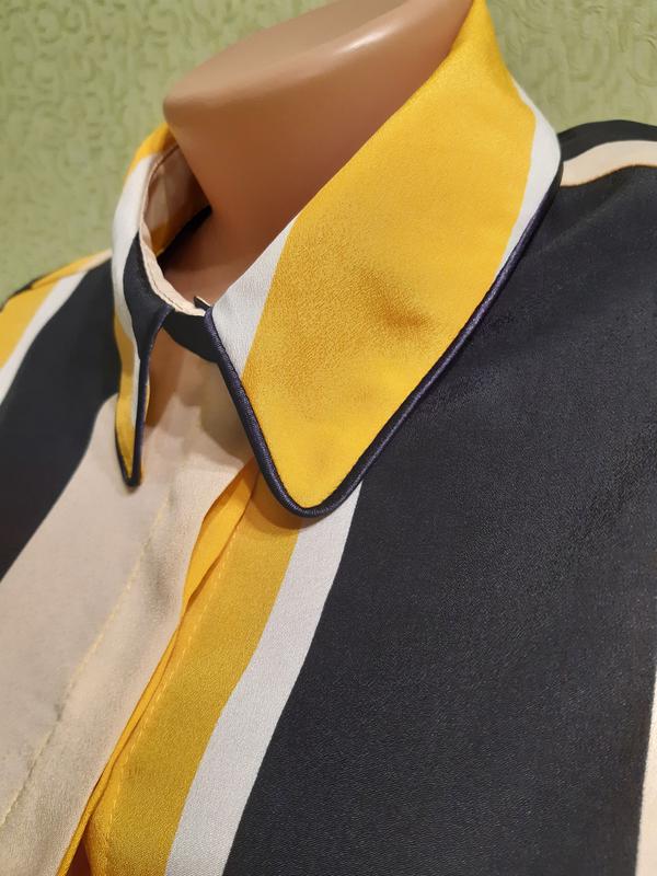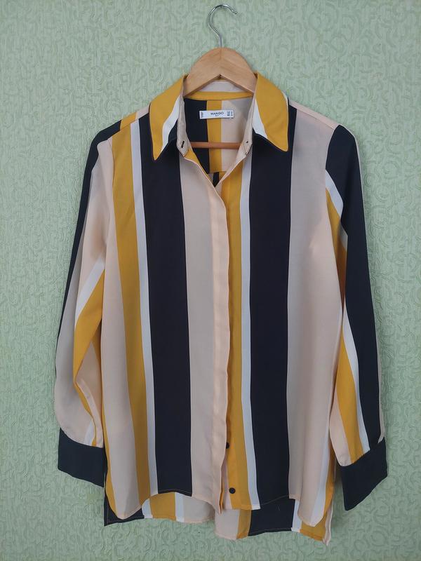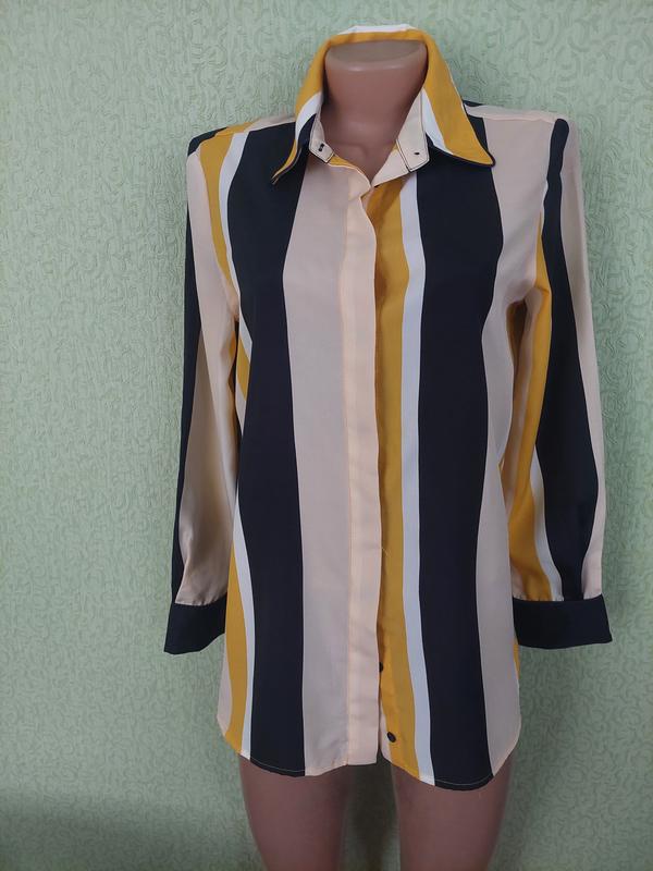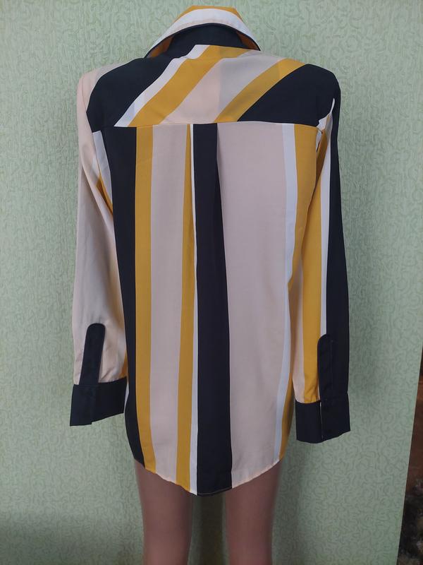 стильная качественная рубашка в широкую полоску базовых тонов, модель свободного прямого кроя с защипами на спине,асссиметричный край низа( перед немного короче), есть боковые разрезы, широкая пройма рукава, качественная отделка манжетов и воротника, застегивается на пуговицы скрытые под дополнительную планочку, ткань приятная к телу практически не мнется линия плеч слегка приспущена 41, грудь 53 бедра 57, длина 69-74, рукав от шва 60. указан размер М, можно и на Л.