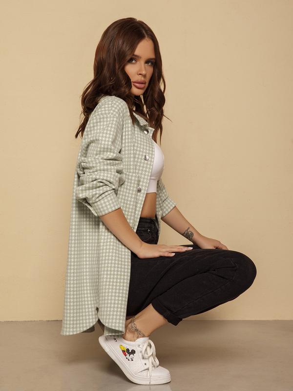Демісезонна м'ятна сорочка на кнопках вільного крою з заокругленим нижнім зрізом. Модель з накладними кишенями і коміром оснащена довгими рукавами. Модель подовженого крою виконана з щільного трикотажу з принтом.