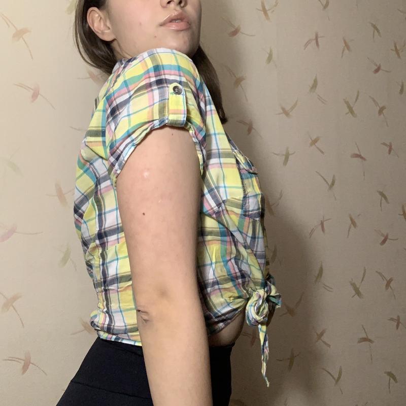 Літня сорочка в яскраві клітку, на зав‘язці знизу.
