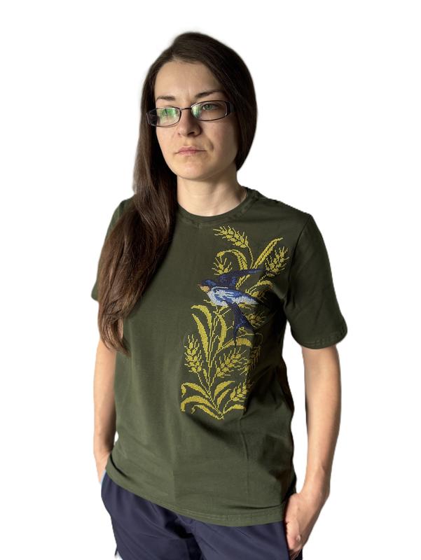 Женская трикотажная вышиванка футболка в цвете хаки ластовицы в колотках