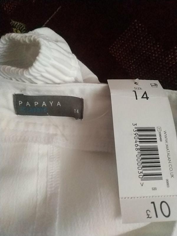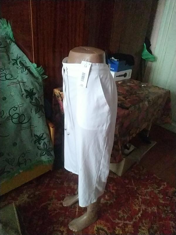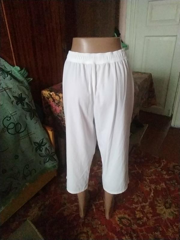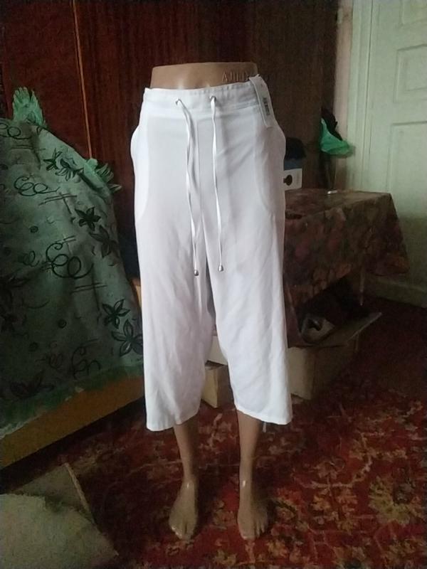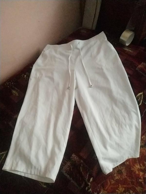 очень красивые белоснежные бриджи.Ткань лёгкая,немного тянется,есть вискоза.По бокам карманы.В поясе сзади резинка,спереди завязки.Размер указано 14,подойдут на л,хл,2хл.