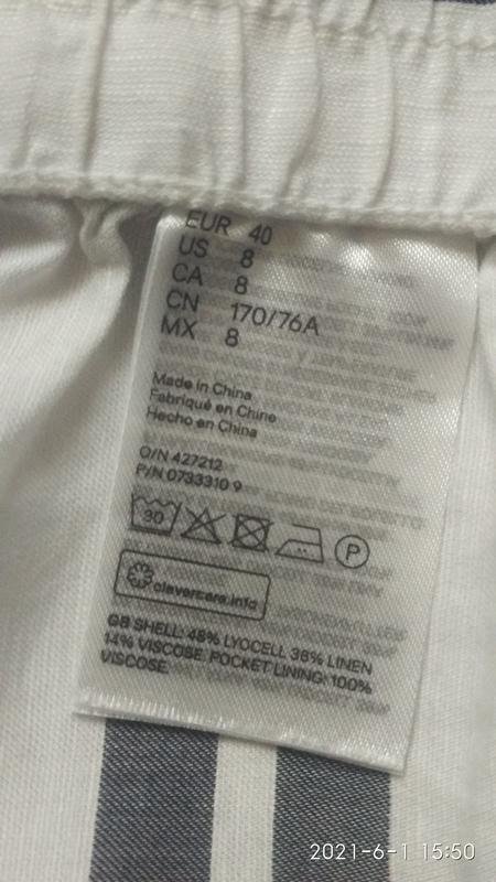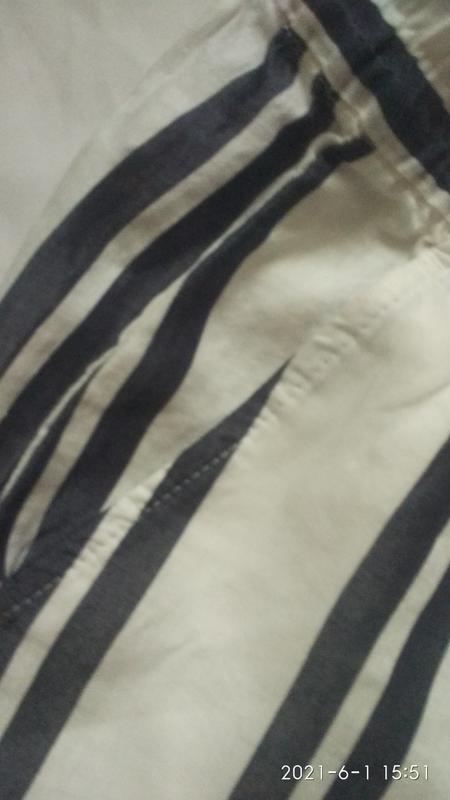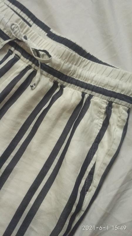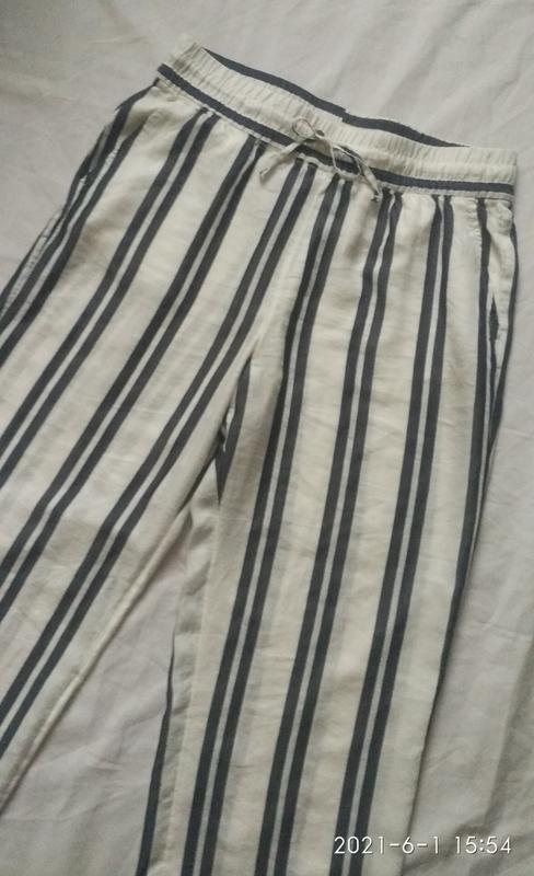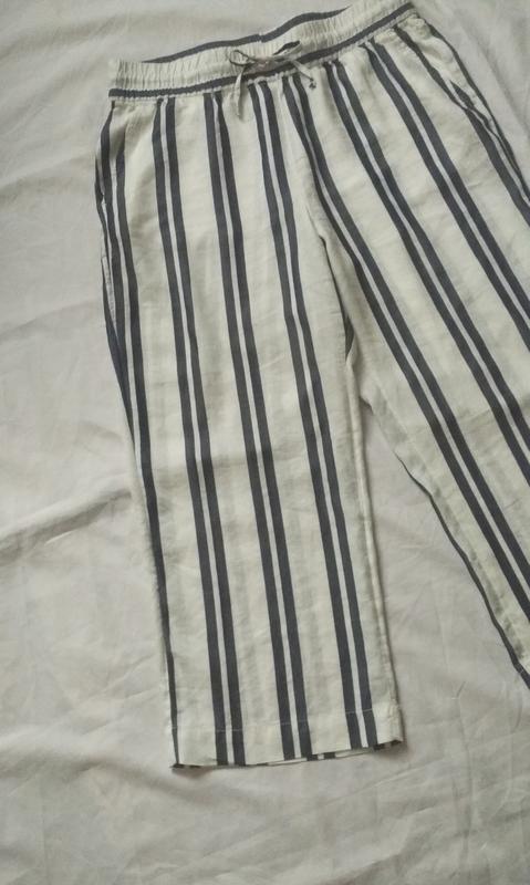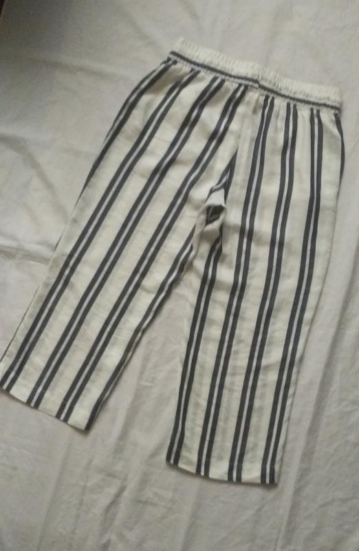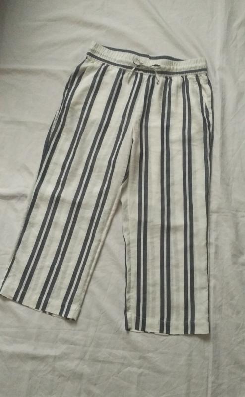 В идеальном состоянии летние бриджи кюлоты белые в синюю полоску.Ткань тонкая,не жаркая.Пояс на резинке,по бокам карманы. Размер указан 12,но ориентируйтесь на замеры: полуобхват пояса-40,поб-56,длина по внешнему шву-88,внутреннему-61,высота посадки перед-32,зад-37,полуобхват штанины вверху-28,внизу-24.Состав ткани:48%лиоселл,. 38%лен,14%вискоза.