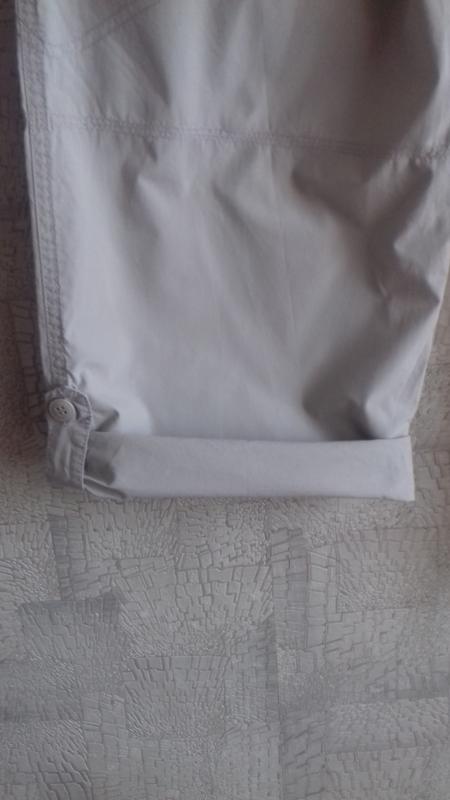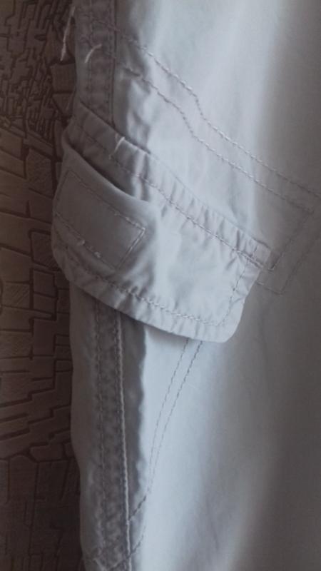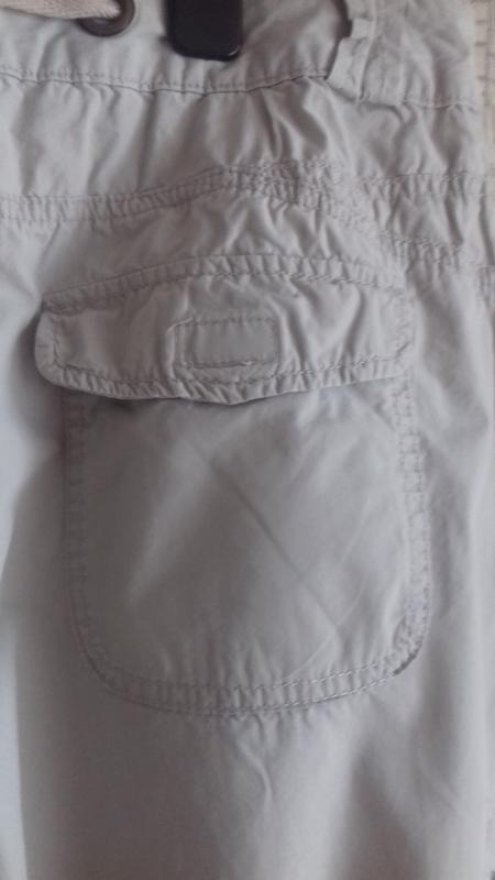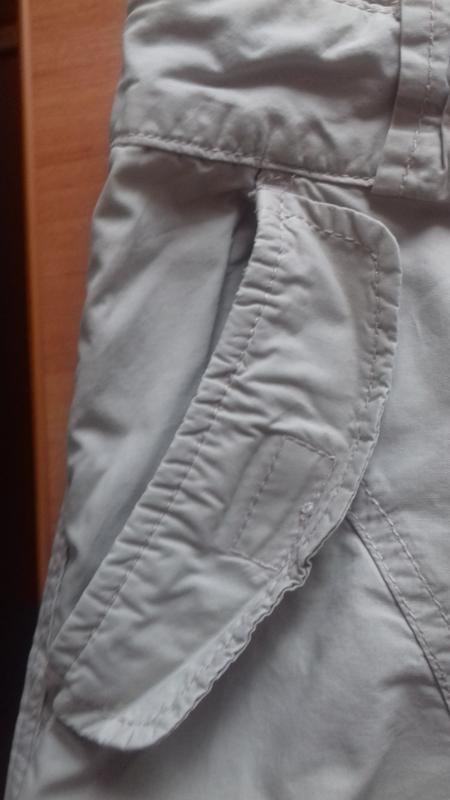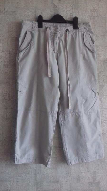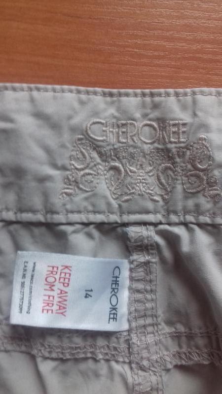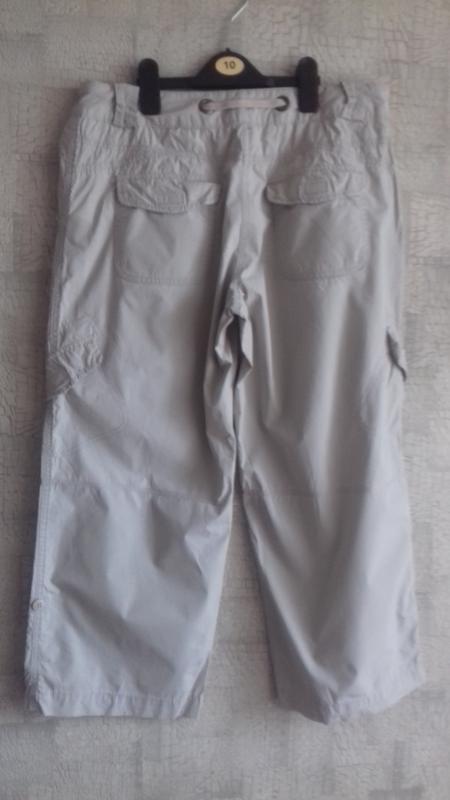 Качественные бриджи в идеальном состоянии, 100% хлопок. Впереди и сзади- по два кармана на липучках и по два кармана на штанинах по бокам, талия может стягиваться шнурком. Размер по этикетке-14. Длина-84см, может подворачиваться до 76см, ширина в талии-44см, ширина по бедрам- примерно 58см, ширина штанины вверху- 34см, внизу-26см, посадка впереди- 24см, сзади- 36см.