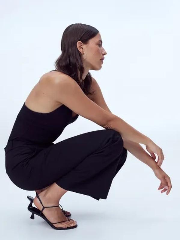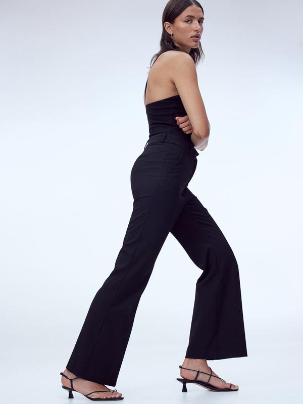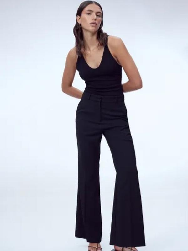 Нарядные брюки из плетеной смеси вискозы. Обычная талия, застежка на молнию с потайными пуговицами и застежками-липучками, штанины со складками. Диагональные боковые карманы, прорезные задние карманы и расклешенные края.