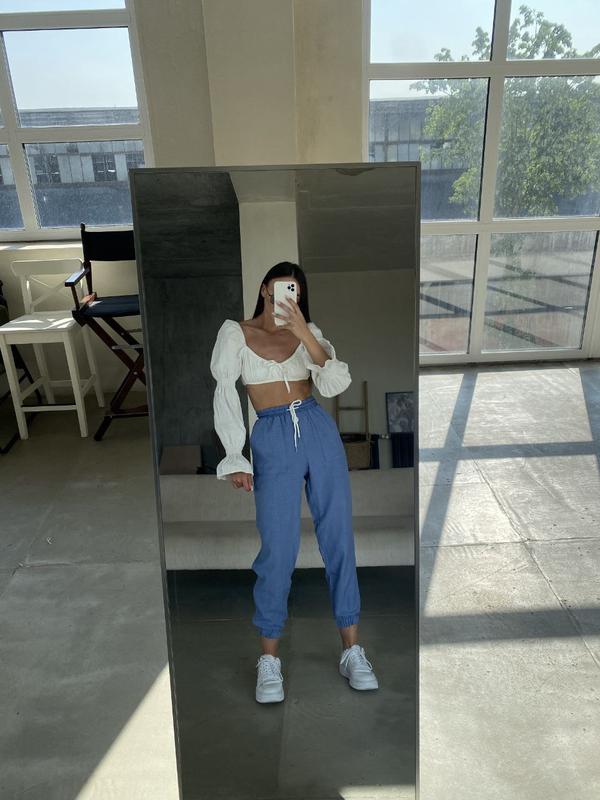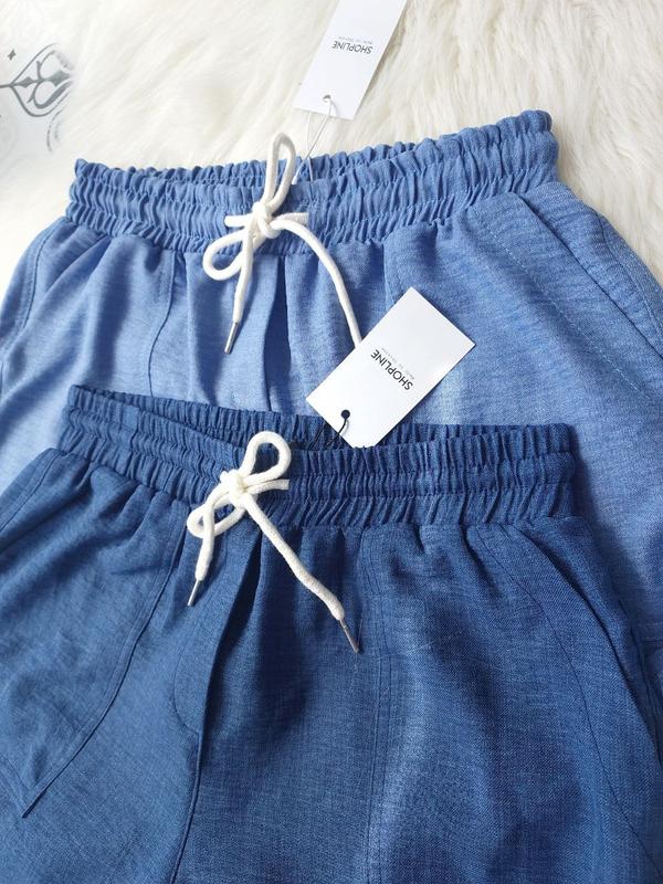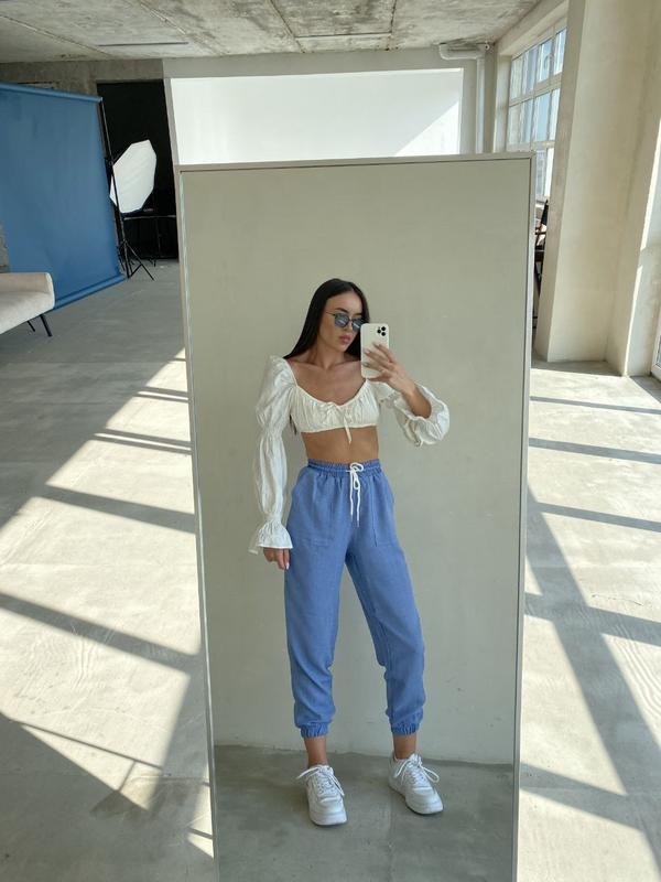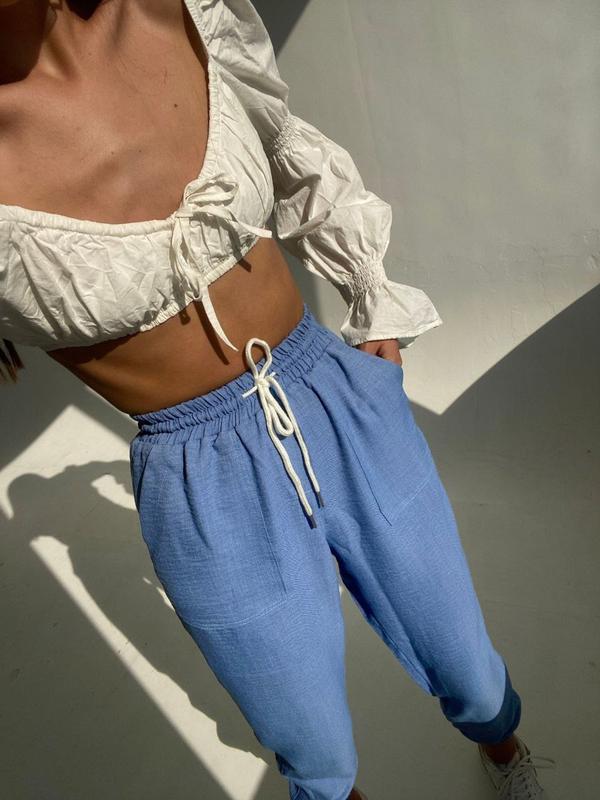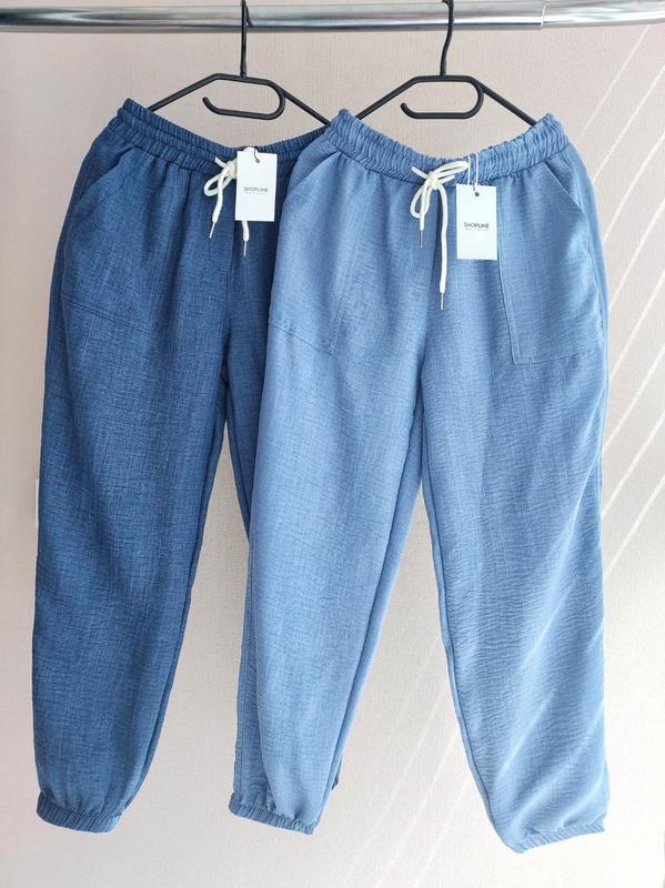 Легкие джогеры на лето из ткани джинс-лен, пояс на резинке со шнурком, по бокам удобные карманы, по низу штанишек резинка. Садятся по фигуре свободно, имеют максимальный комфорт и стильный вид.
