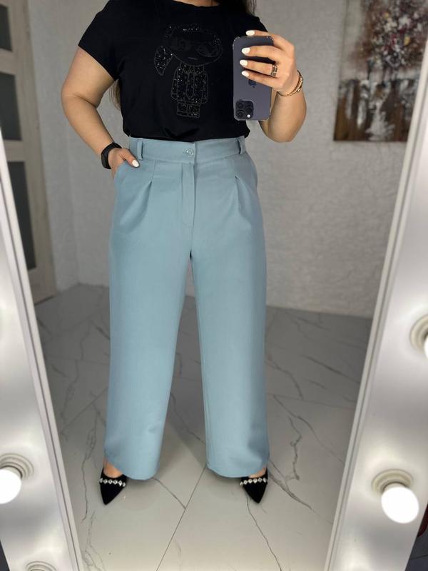 Брюки з високою посадкою , з боків кишені, є шльовки під ремінь, застьобується на молнію та ґудзик
