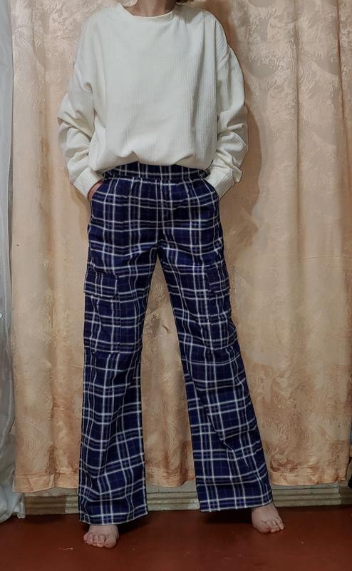 Летние прямые брюки карго в клетку Вязаная h&m, стоит размер подростковый, но отлично подойдут на наш р. ХС. На фото рост 160см 83-64-83. Брюки новые, с бумажной этикеткой. Качество шикарное. Ткань хлопок. Красивый фиолетовый цвет. Брюки на резинке, по бокам на ногах два кармана, спереди два косых кармана, и сзади два кармана с клапаном. Замеры по запросу. Возврат не предусмотрен.