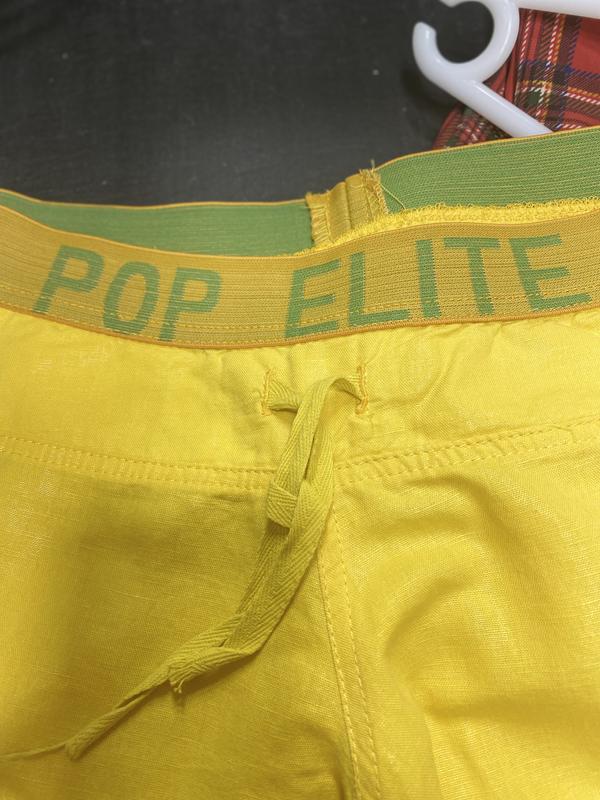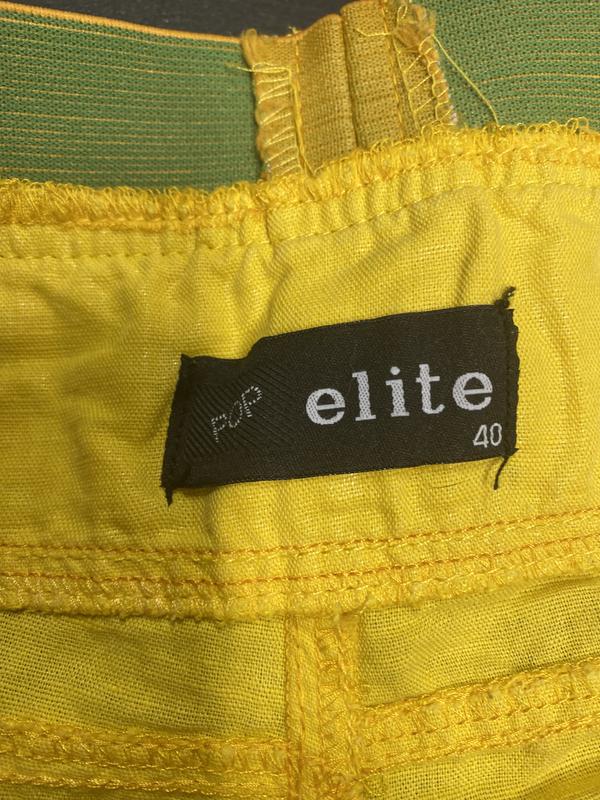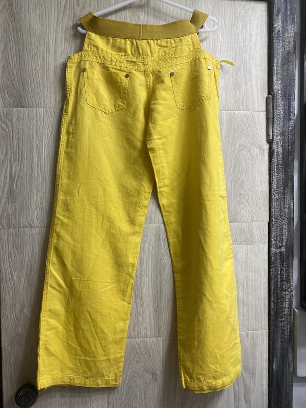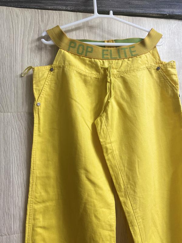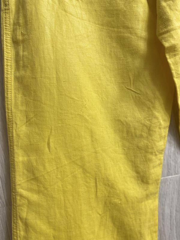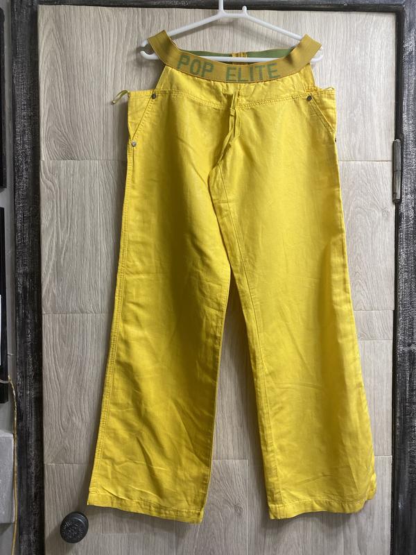 Круті лляні жовті штани на поясі-гумці, з віконцями з боків. насиченого жовто-золотистого кольору, легко прати/прасувати. Заміри: талія/пояс/гума 1/2 - 42(50 тягнеться), стегна 1/2 - 56 см, глибина посадки перед/зад - 22/32 см, длина по боковому шву зовнішн/вн - 100/83, ширина штанини 1:2 - 30/27/27