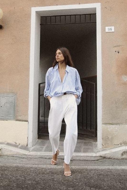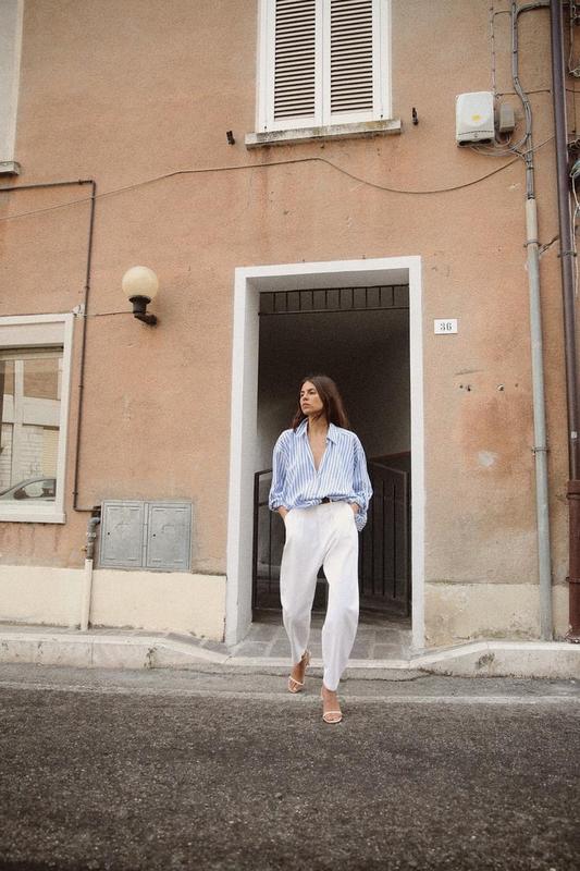 Укороченные брюки с поясом и высокой посадкой. Они застегиваются на молнию и пуговицу спереди. Защепки и карманы спереди, а также накладные карманы сзади.