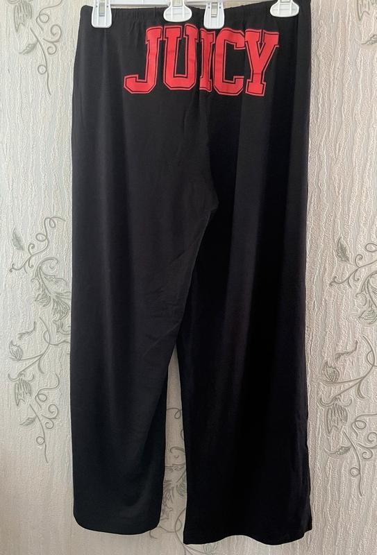 Выполнены брюки из трикотажной ткани, по поясу резинка и дополнительная лента серого цвета, на задней верхней части брюк надпись Juicy красными буквами.