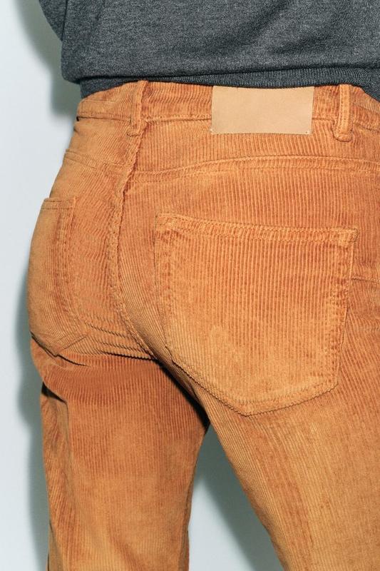 Брюки средней посадки и пять карманов. Петельки для ремня на поясе. Стрелки спереди, расклешенный низ. Застежка на молнию и пуговица спереди.
