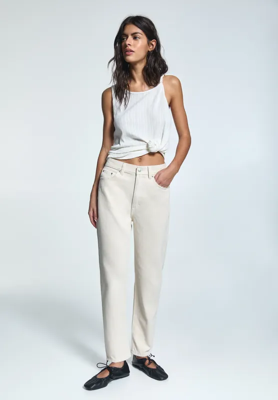 Актуальные бежевые женские джинсы мом однотонные женские джинсы с высокой посадкой джинсы на резинке джинсы с резинкой в талии