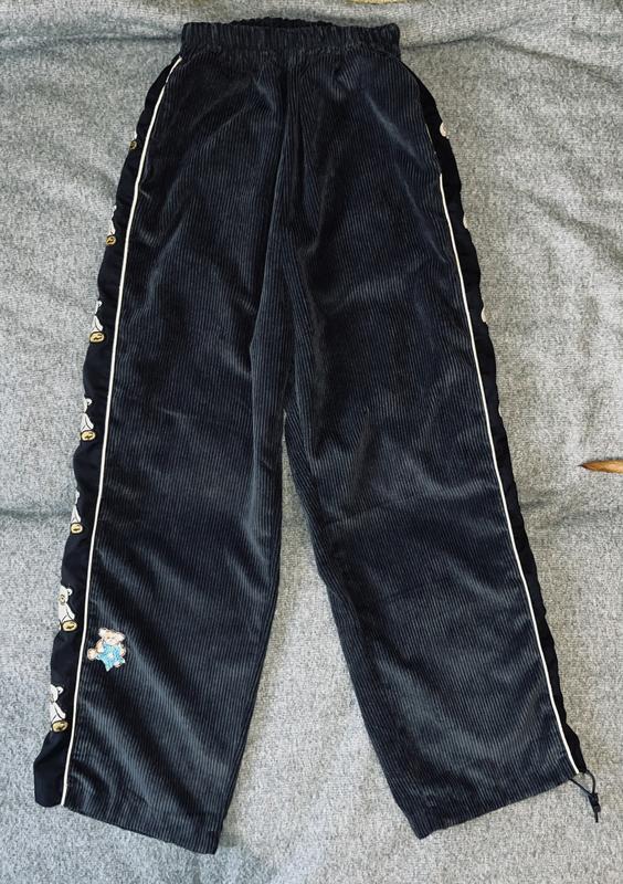 вельветовые брюки с мишками, когда-то были лучшими любимыми,стан 8/10, имеет 2 дефекта,первый это дырочка внизу штанины, перекрыла ее медведем, в глаза в принципе не бросается, и вторая, на одной штанине отсутствует утяжка,все указала на фото