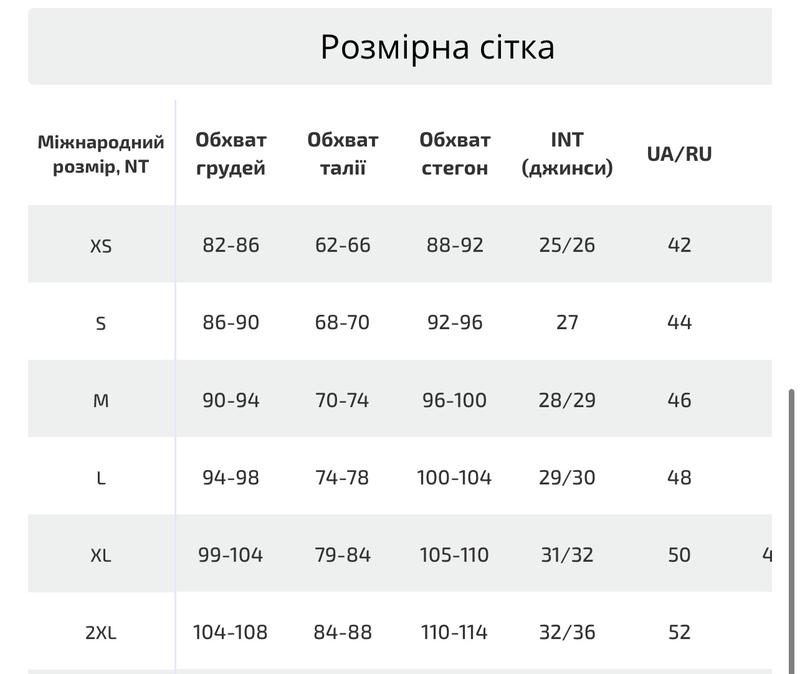 Ширина по стегнам 34 - 48см; 36 - 50см; 38 - 52см; 40 - 54см; 42 - 56см
