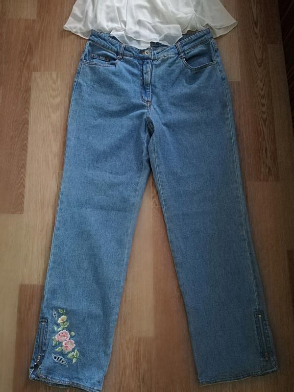 Лёгкие джинсы 7/8,внизу по бокам молнии, на правой штанине красивая вышивка, размер 38,пот 37,поб47(+тянется), длина 93,посадка спереди 24,сзади 39,по штанины внизу 19.