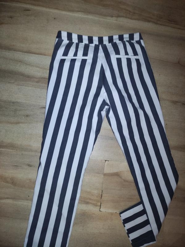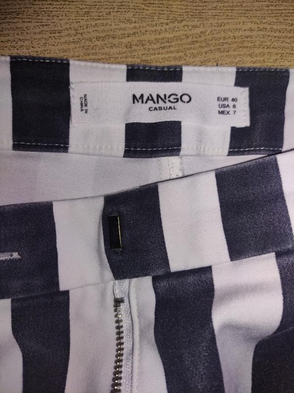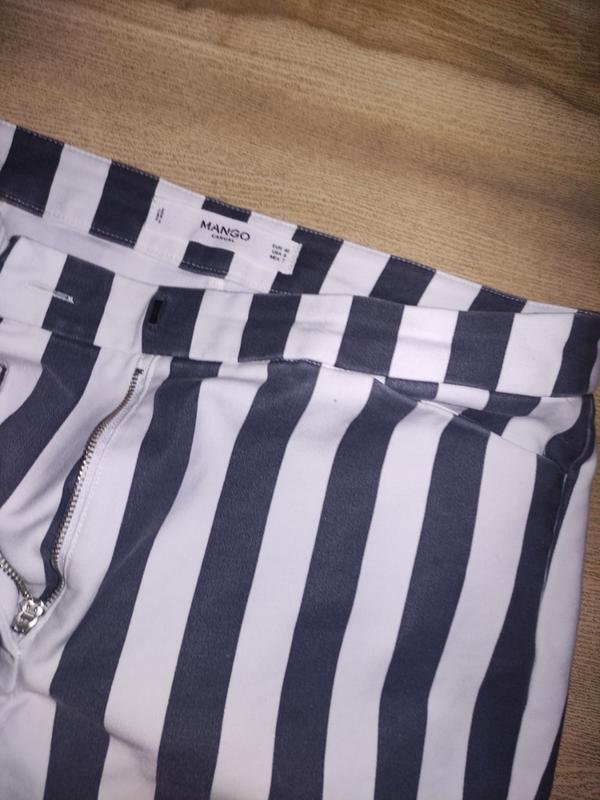 Плотный хлопок, хорошо"стрейчевый".Пот,-39.5 Поб-48 (тянется до 56) ,Длина по боковому шву-91, длина по внутреннему шву-68, полуширина внизу -15.5, нет никах дефектов.Посадка средняя.Очень стройнят за счёт полоски!