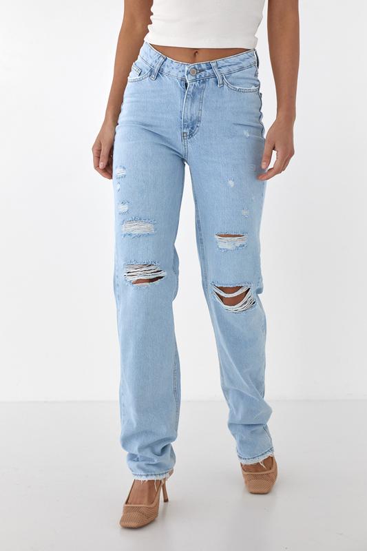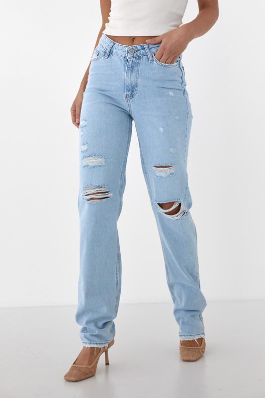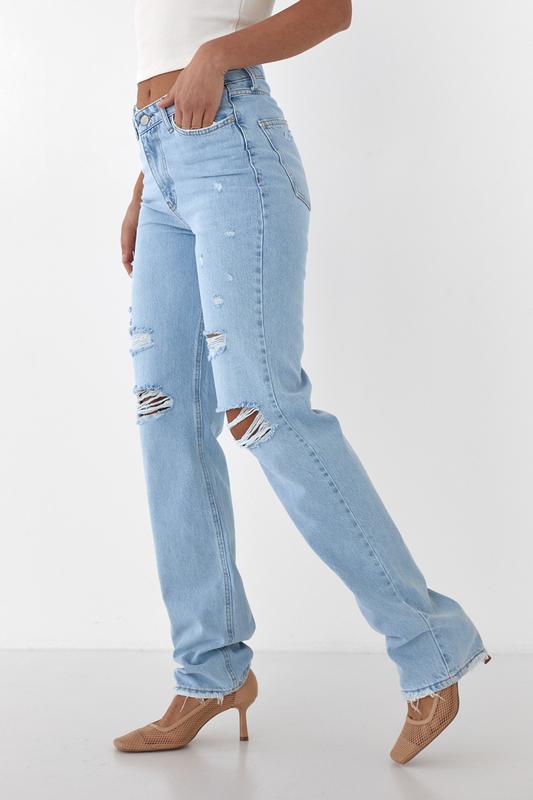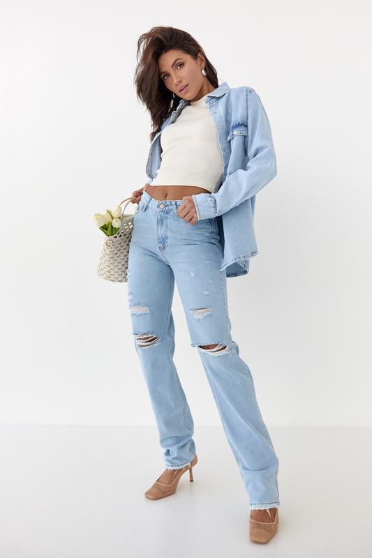На джинсах хаотично расположены рваные дырки и потрепанности.