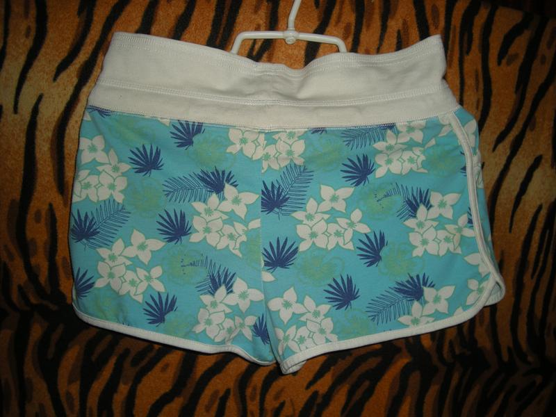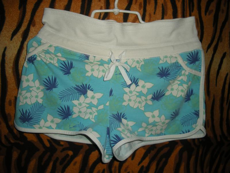 Шикарные летние шорты,фирменные"papaya",65%полиэстер,35%коттон,на бирюзовом фоне белые,синие цветы и зеленые листья,широкая манжет-резинка на талии белого цвета,шнурок стягивает шорты на талии и завязывается на бант,впереди два карманчика-обманчика в складочках,объем талии-80см.,длина по центру-33см.