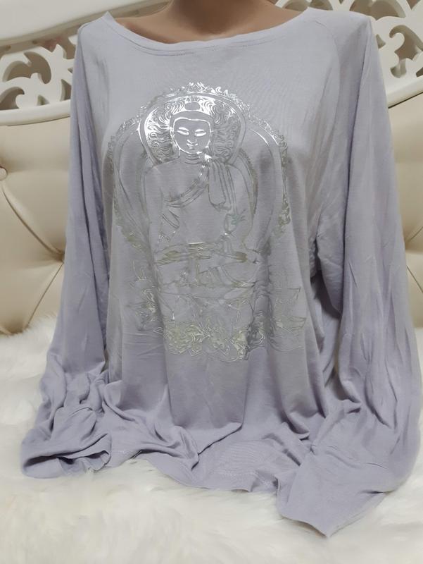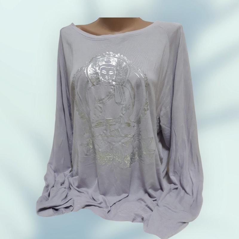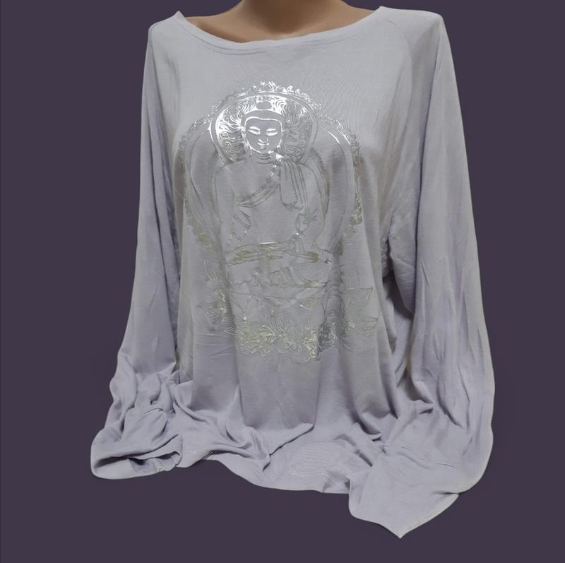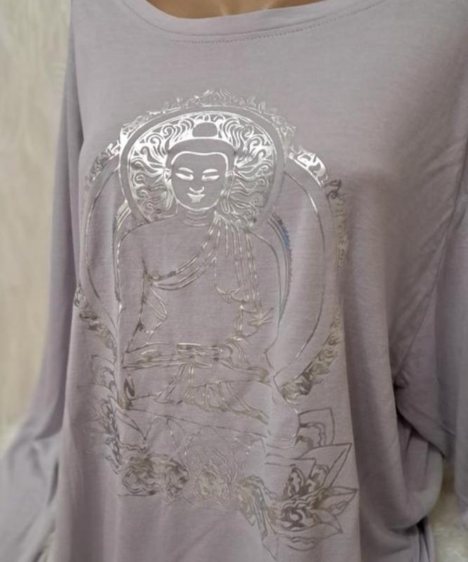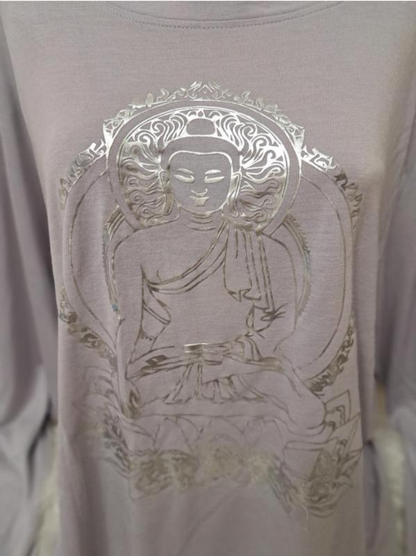 Принт: серебристый образ Будды в медитативной позе, окруженной ореолом и цветами лотоса, что придает одежде символичность и чистоту.