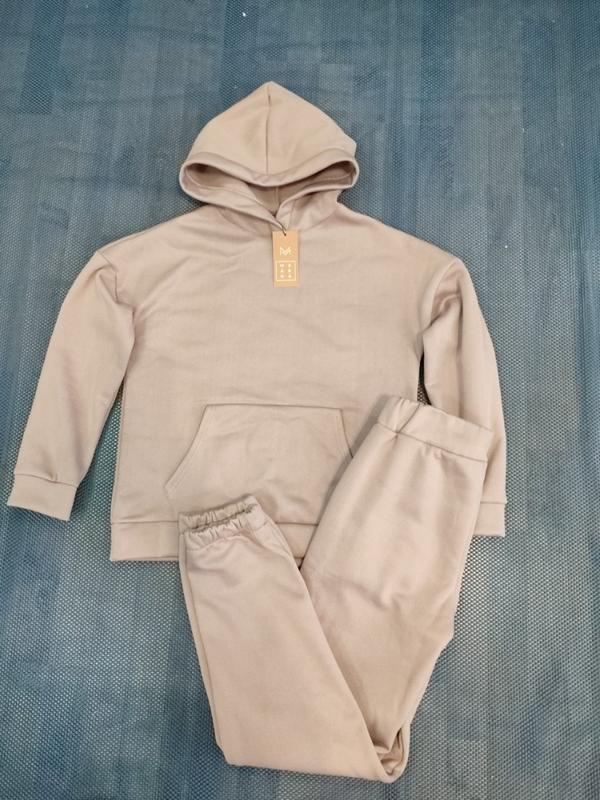 Размер S худи длина 62 см, ПОГ 52 см, по плечам 65 см, рукав 47 см. брюки длина 100 см, шаг 72 см, ПОБ 48 см, ПОП 34 см ( до 45 см).