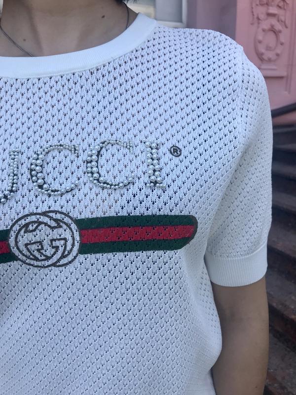 Вязка ажурная , по низу изделия кайма в цветах бренда . На груди рисунок и