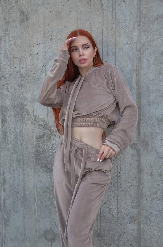Цвет: черный, серый, крем Тканина: велюр(плюш)Описание: Стильный спортивный костюм из мягкого велюра. Комфортный крой, с двойным капюшоном, в брюках-манжеты на широкой резинке.