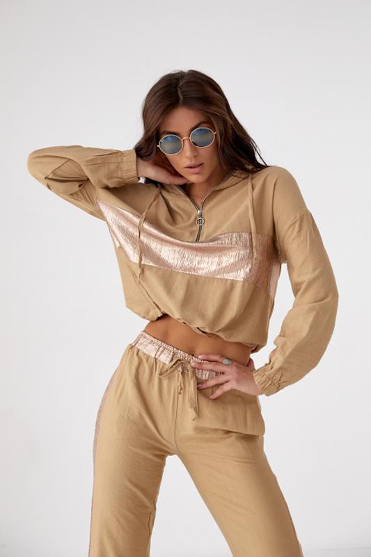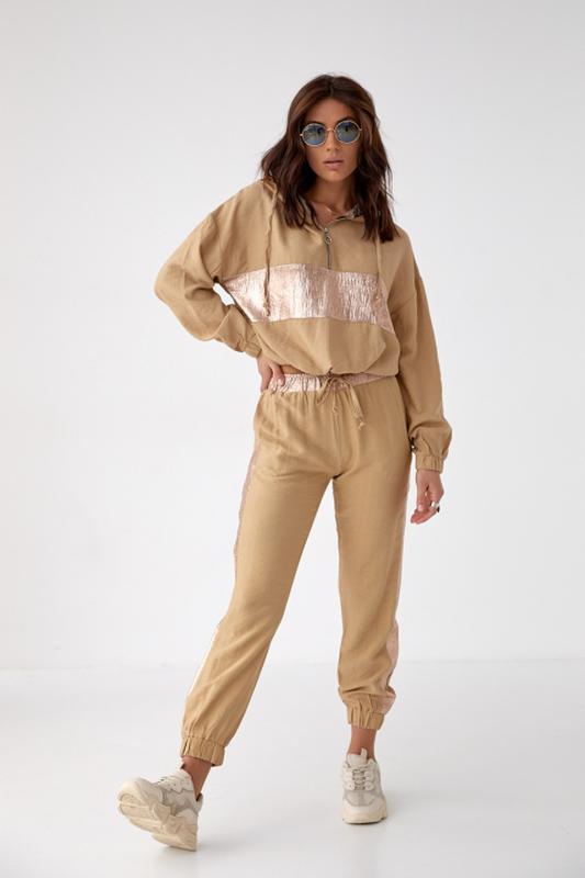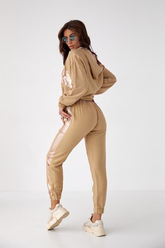 Костюм пошит из вискозного полотна. Качество ткани вас приятно удивит. Яркие, блестящие вставки, которые визуально напоминают мелкие чешуйки, выглядят гармонично и добавляют образу гламурности. Декоративные вставки с блестящим напылением – мягкие и тактильно очень приятные.Костюм состоит из свободных брюк на резинках манжетах 44; и тонкого худи с капюшоном и молнией на лицевой стороне.