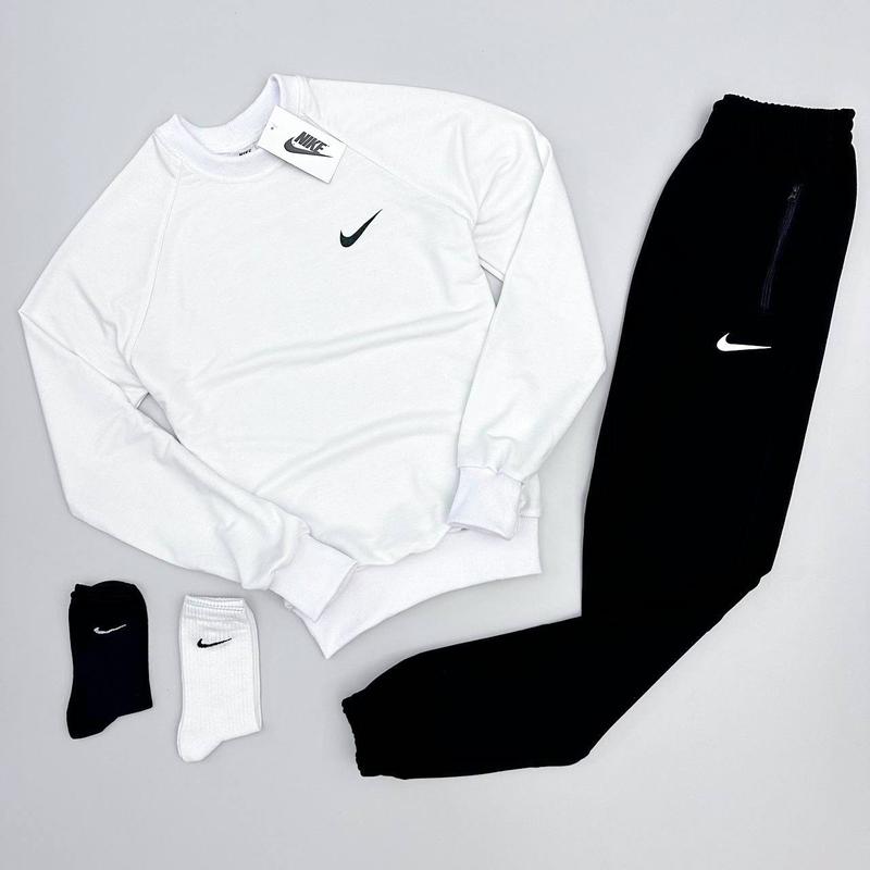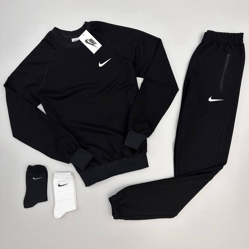 Костюм Nike: свитшот-брюки2 пары носков в подарокМатериал: 95% хлопок, 5% эластана (Турецкая двухнить)Цвет: черныйСезон: весна/лето/осеньРазмер: XS, S, M, L, XL, XXL, XXXLМодель: унисекс ☝🏻